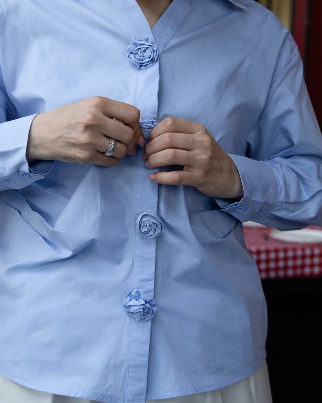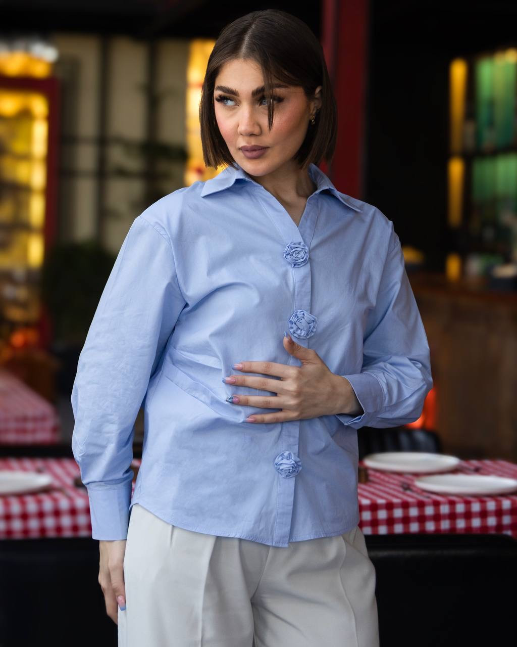 قميص كوالتي عالي ازرار شكل وردة( متحركة)ممكن تخلون الورد او تشيلو مع كسرات بمنطقة الخصر طول القميص70 سم الخامة بوبلين قطن